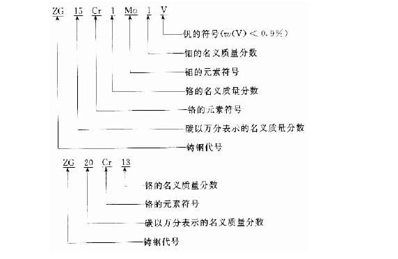 (3)鑄造合金鋼包括以化學(xué)成分為主要驗(yàn)收依據(jù)的鑄造中、低合金鋼和高合金鋼,命名方法是在ZG后面用1組數(shù)字表示鑄鋼的名義萬分表示的碳的質(zhì)量分?jǐn)?shù)。在碳的名義含量數(shù)字后面排列各主要合金元素符號,每個元素符號后面用整數(shù)標(biāo)出其名義質(zhì)量分?jǐn)?shù)。